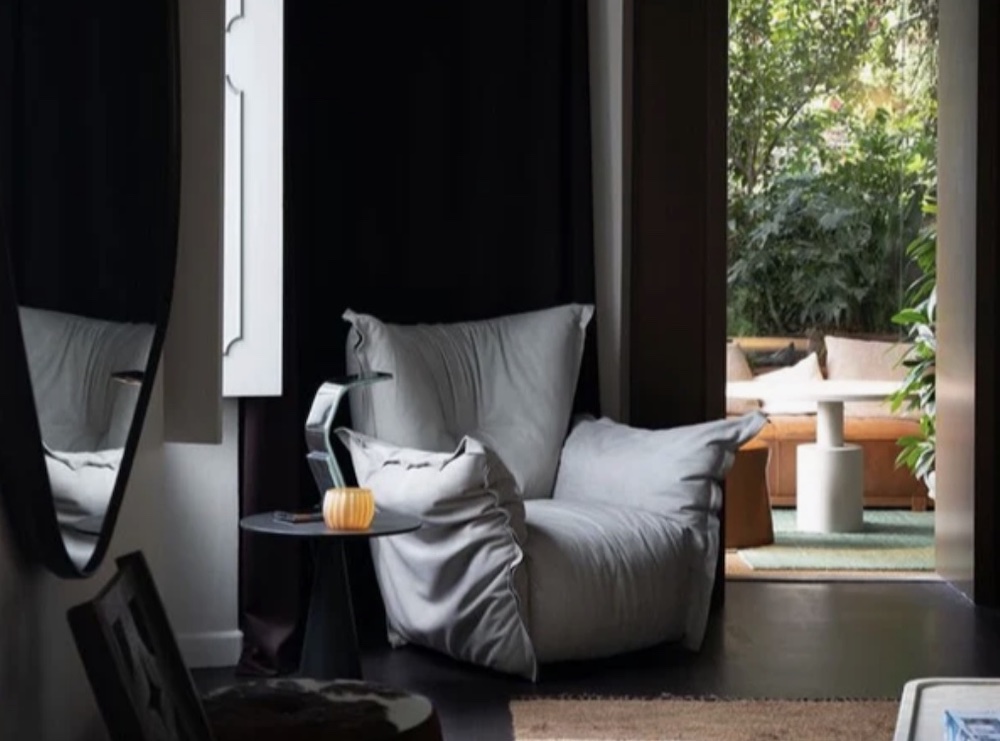 Confortable et enveloppant tout en restant visuellement léger, le Paper Planes conçu par Nipa Doshi et Jonathan Levien part d’un tissu orné d’éléments Swarovski. Les cristaux deviennent presque invisibles et n’apparaissent que lorsque la lumière vient les effleurer, ajoutant une touche de magie à la lecture.
